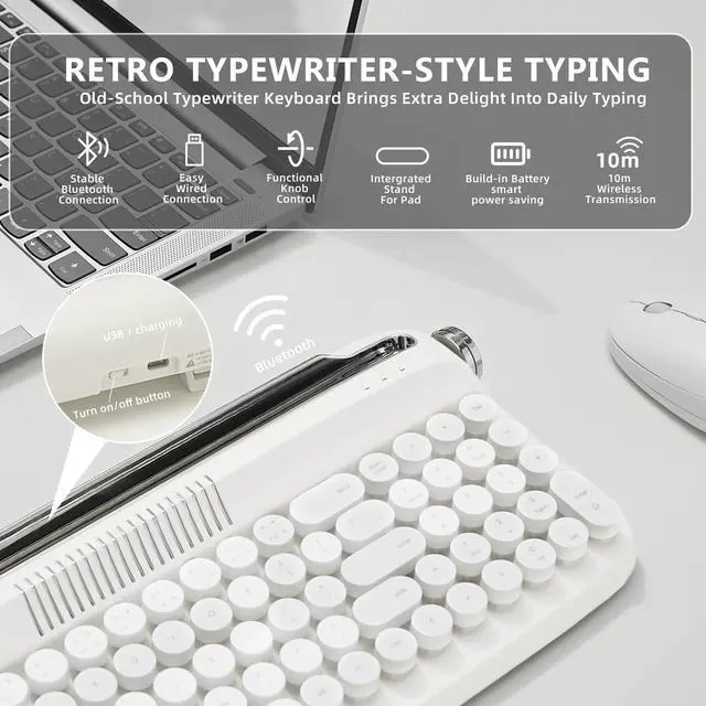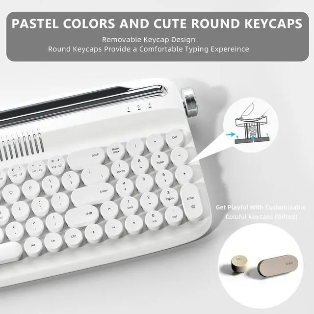 WIRELESS RETRO CUTE KEYBOARD:The YUNZII Upgraded wireless retro keyboard adds knob control, rechargeable battery and Bluetooth & wired connections. The colorful keyboard offers a unique blend of vintage charm and modern typewriter functional, with its compact layout, retro keyboard typewriter style, pastel colored keyboard with round keycaps. Bringing a more enjoyable typing experience for freewrite with this aesthetic keyboard.