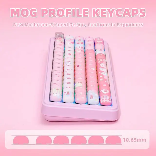 MOG Profile: YUNZII PBT Keycaps comes with MOG Profile, which conforms to ergonomics and is comfortable for typing. The appearance is round and cute, creating a unique aesthetic with a new mushroom-shaped design outline ^^