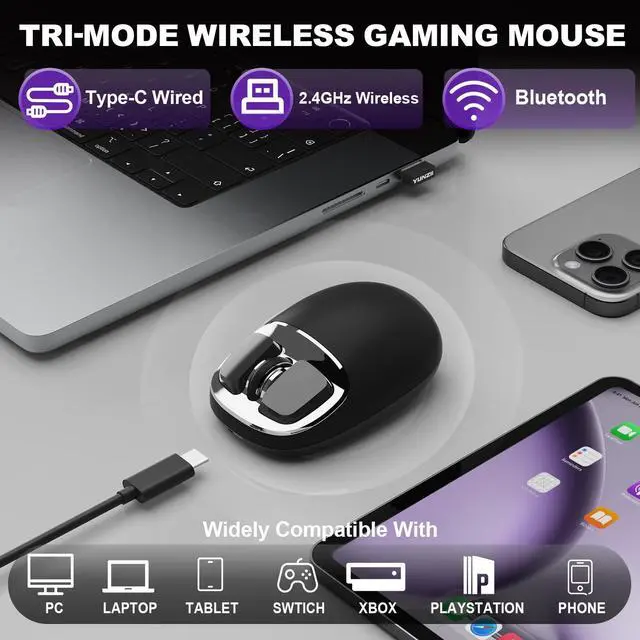 Tri-Mode Seamless Switching - Effortlessly switch between Bluetooth, 2.4GH z wireless, and USB-C wired connections for maximum flexibility and near-zero latency. Universally compatible with Windows, macOS, Android, and iPad OS, this wireless mouse ensures you stay productive across your computer, tablet, and phonewithout ever missing a click ^^ 6-Level DPI Gaming Mouse- Customize your cursor sensitivity across 6 precise settings (800/1200/1600/2400/3200/4800). Whether you're navigating detailed spreadsheets, editing photos, or a game, this gaming wireless mouse delivers the perfect speed and precision for any application ^^ Full Customization, Your Rules - Take complete command of your device.