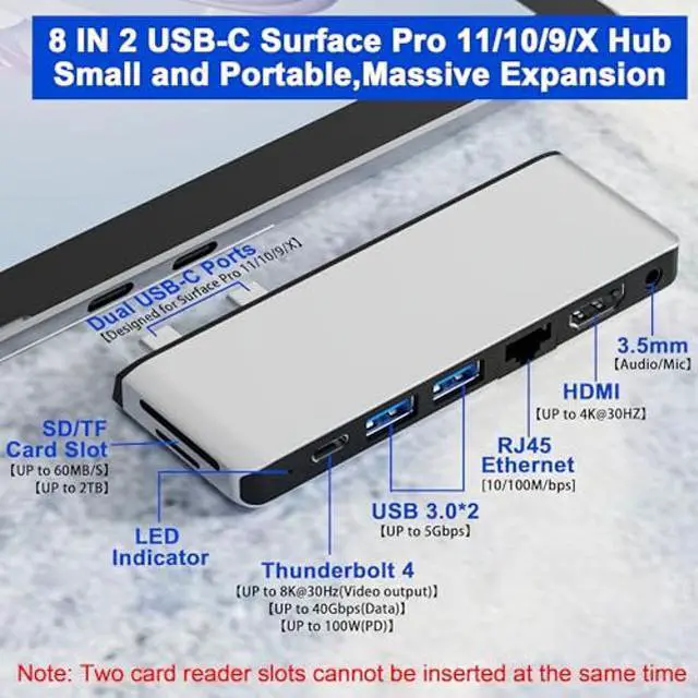 • Designed for the Surface Pro 11/10/9/X : Docking station specially designed for Microsoft Surface Pro 11/Surface Pro 10/Surface Pro 9/Surface Pro X, with 8 ports: 1X 4K HDMI, 1X Thunderbolt 4 USB C port (8K@30Hz Video Display + 40Gbps Data Transfer + 100W PD Charging ), 1X 100M RJ45 Ethernet, 2 X USB 3.0 ports, 1X SD card reader slot, 1X TF card reader slot, 1X 3.5mm Audio Port. This usb dock station can easily connect all your accessories.Note: This Surface Pro dock will not fit well with your Surface Pro 11/10/9/X if using a protective case.