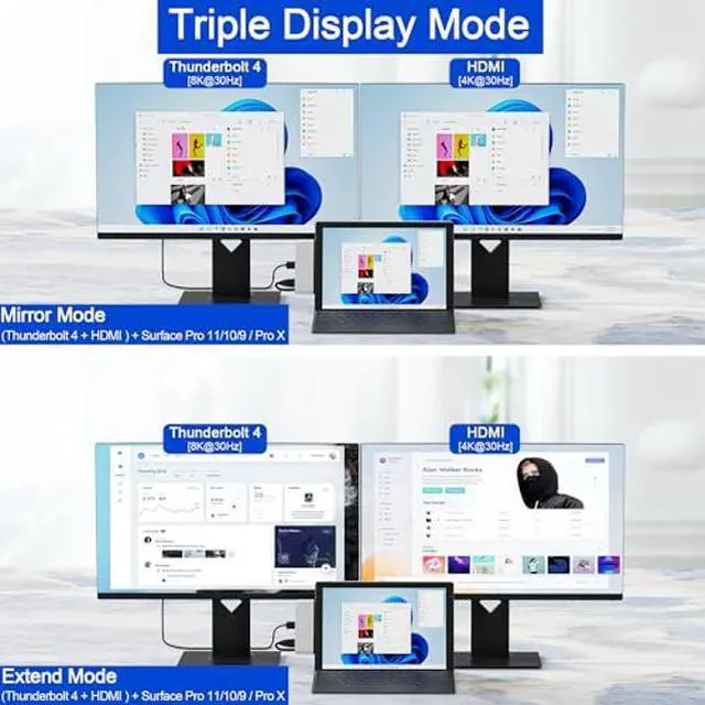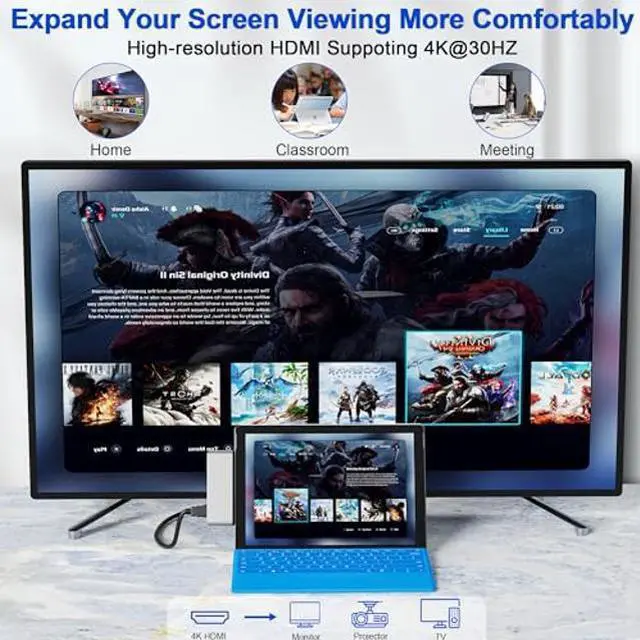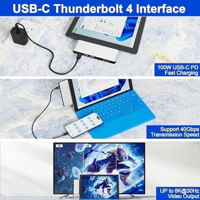 • HD Video Triple Display:Surface pro 11 accessories allows you to expand 2 screens (UHD 4K@30Hz HDMI interface + 8K@30Hz USB-C Thunerbolt 4 interface) + Surface Pro 11/10/9/X monitor triple display at the same time, you can perform different projects on different monitors to improve work efficiency. Supports extension or mirror mode. HDMI resolution up to 4K@30Hz, USB-C Thunerbolt 4 resolution up to 8K@30Hz.