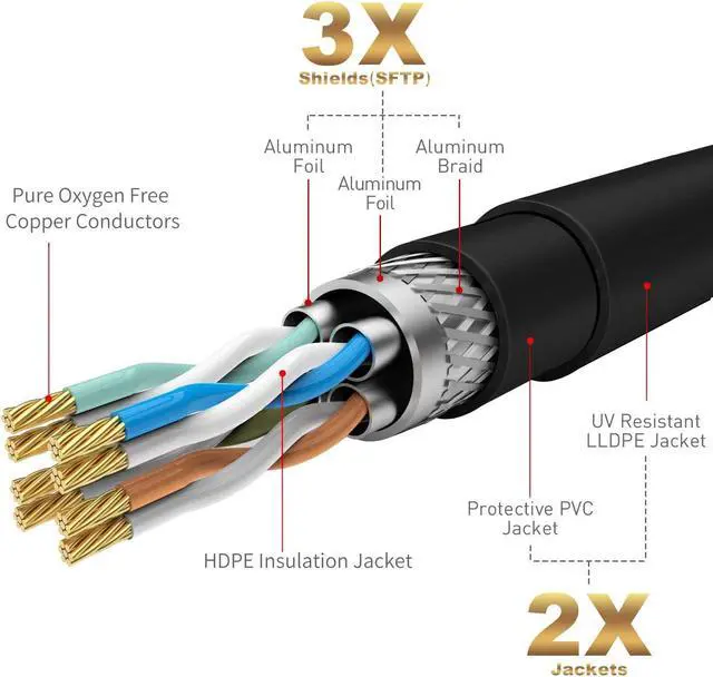 [(Outdoor and Direct Burial Rated)] Adoreen Cat7 Outdoor Ethernet Cable is ideal for outdoor and direct buried installation. It can withstand temperature changes, sunlight, soil, water, snow, potential wildlife and other outdoor factors. Buried directly underground or used in conduits. Don't worry about being crushed or damaged.