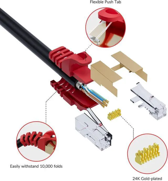 [(Triple Shielded SFTP & Gold-Plated Connectors)] Made of 4 Pairs of 26 AWG Stranded OFC pure copper wires with two Gold-Plated RJ45 connectors on each end. - Each Twisted Pair is shielded with Double Aluminum Mylar Foil +64 Aluminum Braid Shield . 50 Micron Gold-plated Contact Pins in each connector.Anti-c