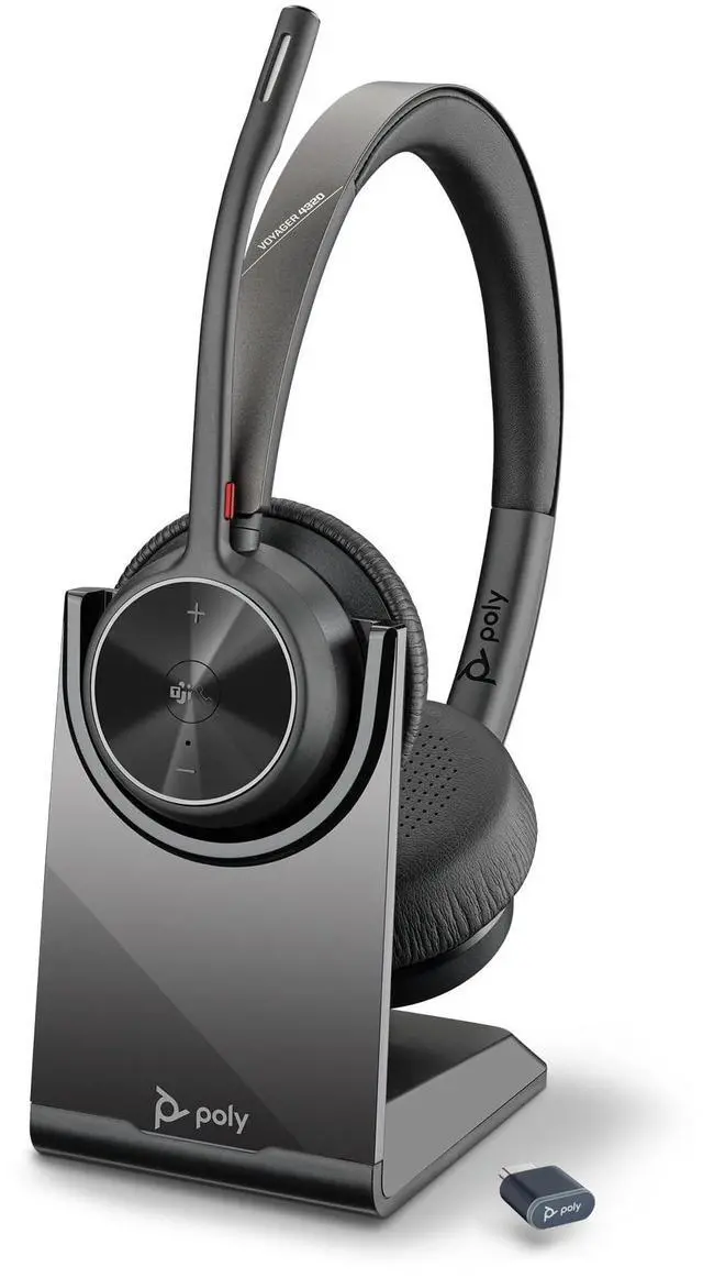 Free yourself from your desk with the Voyager 4320 UC Bluetooth over-the-head stereo headsetperfect for professionals who need to connect and stay productive at the office, home, or both. The Voyager 4320 Bluetooth headset lets you connect to your PC/Mac and move freely throughout your home or office up to a 164 feet (50 meters) range with the included BT700 USB-C Bluetooth adapter (or connect via USB-A using included USB-C to USB-A adapter) and/or connect to a mobile phone using Bluetooth 5.2. You can even use your headset corded using audio-over-USB mode. And, with up to 24 hours of talk time (plus included desktop charging stand, )