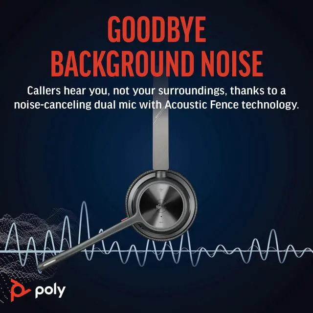 adjustable padded headband, and memory foam ear cushions, the Voyager 4320 UC headset lets you comfortably talk and multi-task all day. Enjoy clear audio quality on every call with a noise-canceling, dual microphone with Acoustic Fence technology that blocks out unwanted background noise, so callers hear younot your surroundings. This Voyager 4320 UC Microsoft Teams certified headset also features a dedicated Microsoft Teams button for instant access to the Teams app, as well as integration with Zoom, and other platforms for trouble-free online meetings and collaboration. Whats more, clear dual LED indicators let others know at a glance when youre on a call so you stay in the zone.