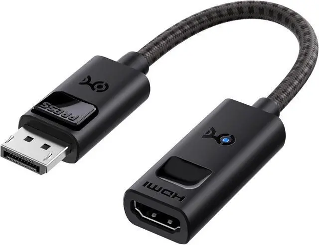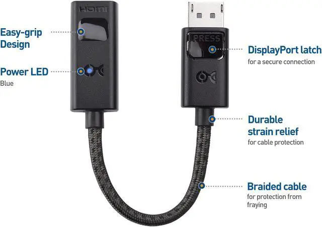 Premium DP to HDMI adapter features a braided cable jacket for fraying protection; DP to HDMI adapter includes molded strain relief for improved durability and an LED light to indicate i