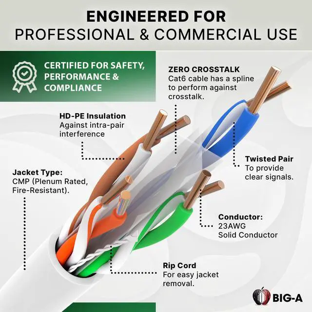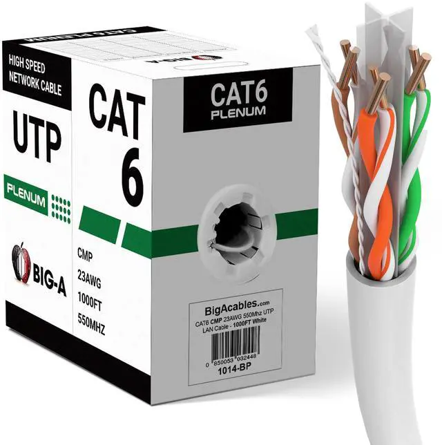 Power up your network with the Big-A Plenum Cat 6 Ethernet Cable, a professional-grade solution for high-speed data transmission in commercial and residential setups. With a CMP plenum rating, this 1000ft bulk cable is specifically designed for safe installation in air-handling spaces, such as ceilings and walls, ensuring compliance with industry safety standards. Built for versatile networking needs, this Cat6 cable is compatible with PoE devices, routers, switches, IP cameras, VoIP systems, and more. Whether you're setting up a home network, office, or large-scale commercial infrastructure, this cable provides the durability and flexibility needed for seamless connectivity.