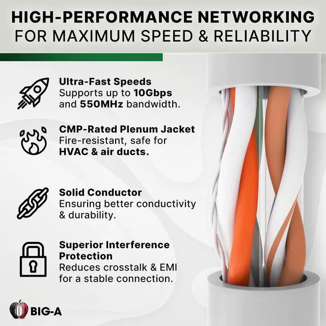 Engineered to handle up to 10Gbps speeds and 550MHz bandwidth, this unshielded twisted pair (UTP) cable minimizes interference and enhances signal stability. It features 23 AWG solid copper-clad aluminum (CCA) conductors, delivering reliable performance for modern networking applications. Why Choose Big-A Cat 6 Plenum Cable? Superior Data Transfer - Supports up to 10Gbps Ethernet speeds with 550MHz bandwidth, ensuring smooth, high-speed performance. Plenum-Rated for Safety - Meets CMP fire and safety regulations, making it ideal for air ducts, drop ceilings, and enclosed spaces. High-Quality UTP Construction - Designed to reduce signal interference and enhance transmission clarity.