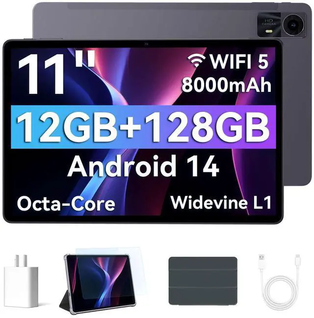 Android 14 Tablet 11 Inch Tablets, Octa-Core, 12GB RAM 128GB ROM, 1TB Expandable, 1920x1200 HD IPS Display, 8000mAh, 18W PD Fast Charging, WiFi 5, BT 5.0, Dual Camera, GPS, Drop-Proof Case - Gray