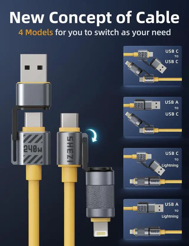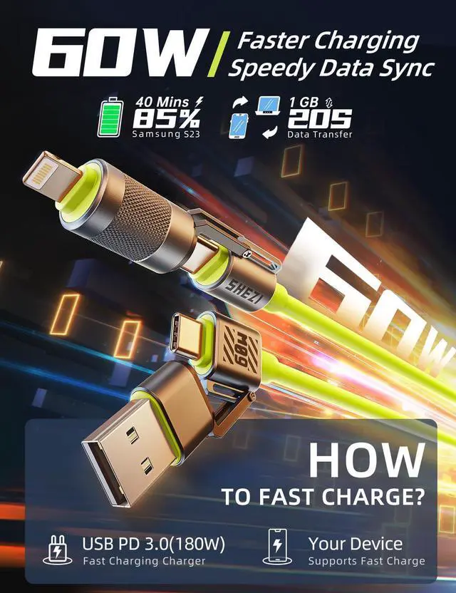 [(The All-Device Key & 4-in-1 Cable)] USB A+USB C+Lightning+USB C= All your cables. Still bothered by having to carry a bunch of charging cables every time you travel? This Jixivor 4 in 1 charging cable is your ultimate gear. 4in1 fast charging cable features 4 ports: [USB C to USB C] [USB C to Lightning] [USB A to USB C] [USB A to Lightning], compatible with all your digital devices. Compatible with iPhone Samsung, Tablet, Air Mini Pro, Macbook and More. With just one charging cable, you can easil