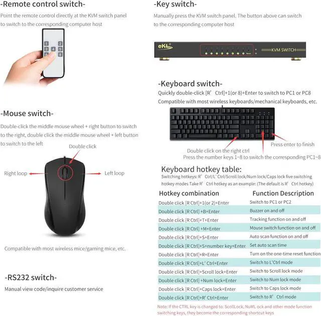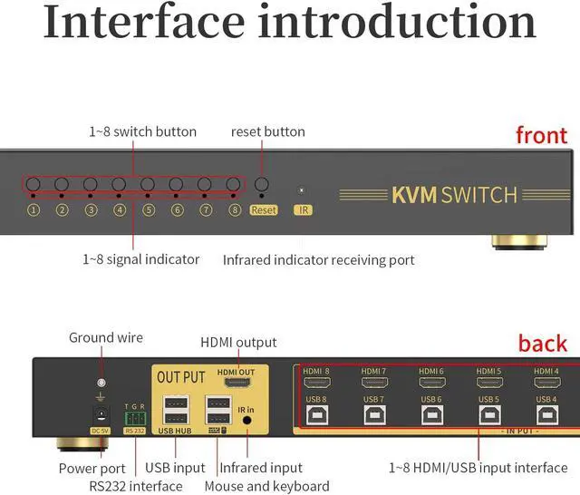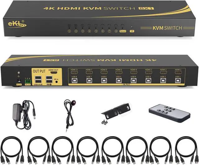 8 PORT KVM SWITCH: 1 USB console controls 8 HDMI - interface devices to one display and one set of keyboard and mouse. Supports 3 switch modes: Button Switch/ Keyboard Hotkeys Switch. It also supports Hot-Plug that you can plug and unplug it without shut down the devices.