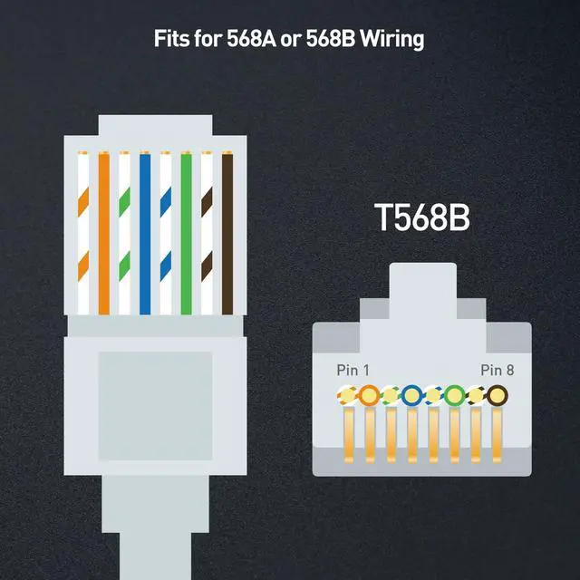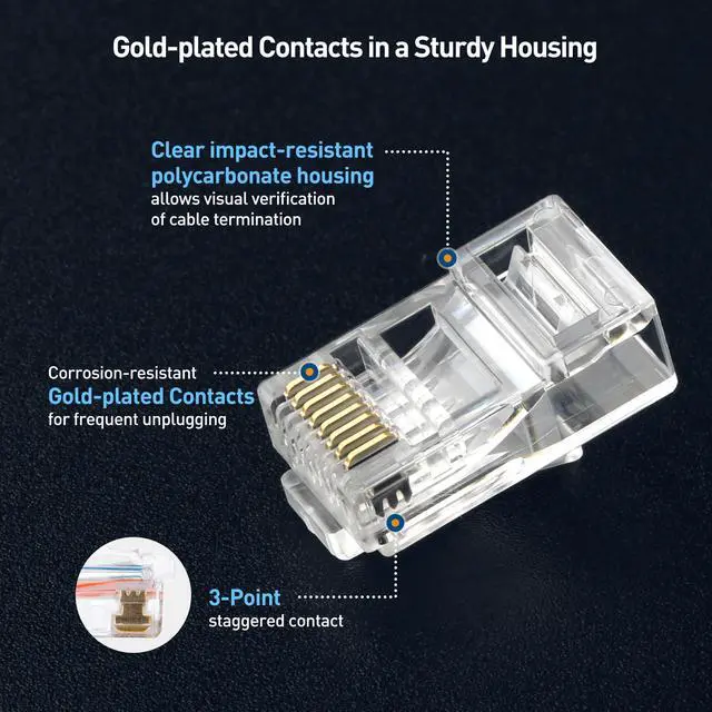 DIY NETWORK PATCH CABLE RJ45 connectors terminate unshielded twisted pair stranded or solid cable for making a custom-length Cat 6 Ethernet cable; Supports 23 to 28 AWG round or flat stranded wire with an outside diameter up to 6.3mm