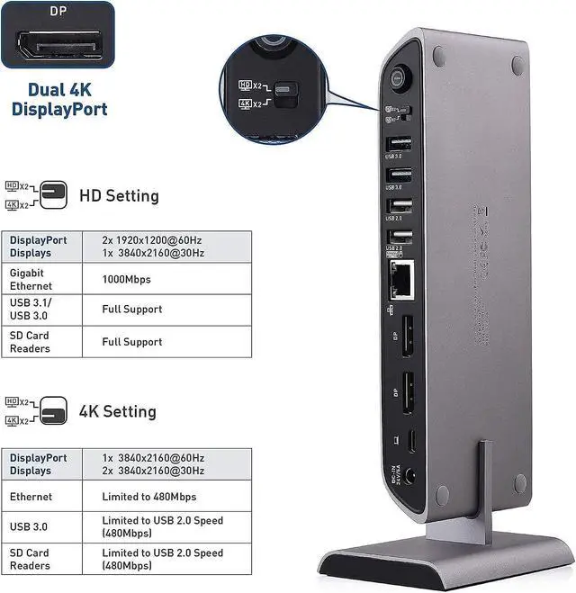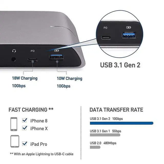 USB-C DOCKING STATION solution for a Windows computer with a USB-C or Thunderbolt 3 port; USB Type-C laptop docking station charges a notebook while in use up to 80W; Connect a wireless mouse or keyboard and add a wired Ethernet network with this USBC dock; USBC Docking Station supports file transfer from an SD card or a USB 3.0 flash drive; Expand your workspace with dual 4K HDMI UHD displays with this laptop docking station dual monitor