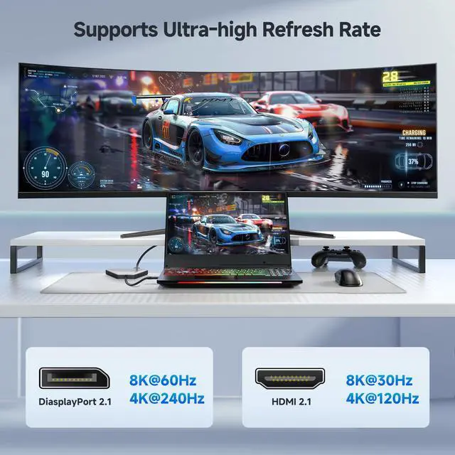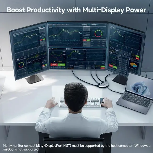 Unmatched 4-Display Output with High Resolution: Elevate your workspace with the 4K Quad Display USB C MST Adapter, supporting up to 4 monitors. Achieve 8K@60Hz/4K@240Hz over DisplayPort 2.1 or 8K@30Hz over HDMI 2.1 for a single display. For multi-display setups, enjoy 4K@120Hz on dual displays and 4K@60Hz on triple or quad setups, with DSC 1.2 enabled for optimal performance.