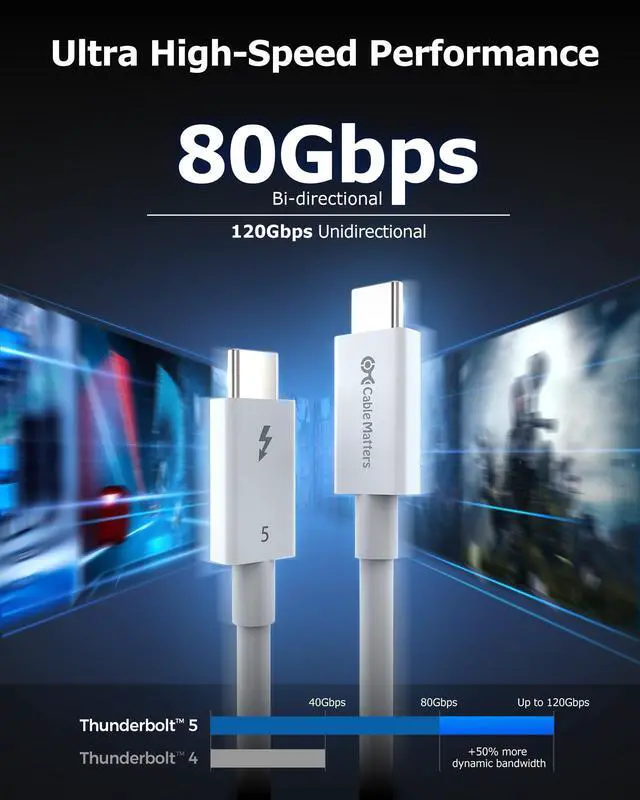 Bandwidth Boost for Video: Drive multiple ultra high resolution and high-refresh rate monitors with one cable; This Thunderbolt 5 cable supports 120Gbps unidirectional video connectivity, enabling support for multiple 8K displays, up to 540Hz for gamers and three 4K@144Hz for creators.