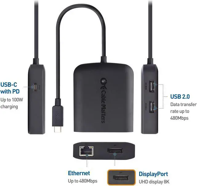 Cable Matters USB C Hub DisplayPort 100W, 4K@240Hz (USB C DisplayPort 1.4 Hub), 480Mbps Ethernet, 2X USB, 100W Host Charging in Black - Thunderbolt 4 / Thunderbolt 3 Port Compatible for MacBook Pro