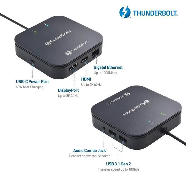 Expand your connectivity with the Cable Matters Thunderbolt 3 docking station; Thunderbolt 3 hub turns a devices Thunderbolt 3 port into a connectivity powerhouse with 2 video ports, 2 USB ports, a 3.5mm audio port, Gigabit Ethernet, and pass-through host charging