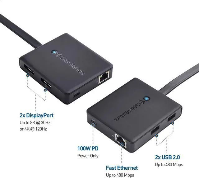 Expand your workspace with the Cable Matters Multiport USB C Dock with Dual DisplayPort; Add up to two monitors, two USB 2.0 peripherals, 480Mbps wired Ethernet networking, and pass-through charging to a USB-C enabled desktop or laptop