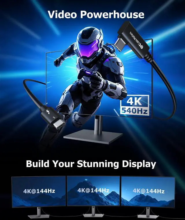 Universal Compatibility: The 90 degree Thunderbolt 5 cable connects seamlessly with Thunderbolt 3, Thunderbolt 4, USB4, and USB-C devices. Whether you're using the latest laptops, high-resolution monitors, external SSDs, or docking stations, this cable offers plug-and-play flexibility with full backward compatibilityideal for professional and home office setups alike.