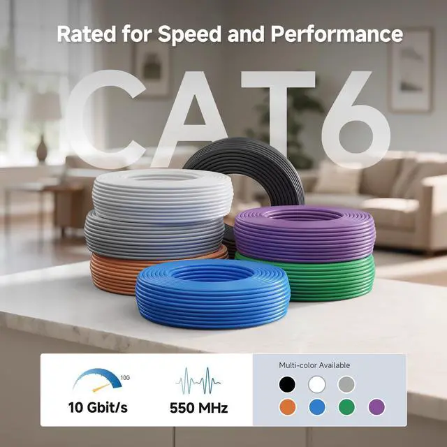 MHz Bandwidth: This solid, durable Cat6 Ethernet wire supports up to 550 MHz bandwidth for fast data transfers. Perfect for servers, cloud computing, PoE devices like video surveillance, and HD video streaming.