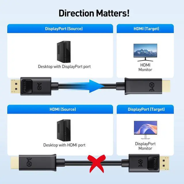 Stable Signal: Gold-plated connectors, bare copper conductors, and foil & braid shielding combine in this Display Port to HDMI cable (DP to HDMI adapter cable, Display Port to HDMI cord) to deliver superior performance, reduce electromagnetic interference, and ensure stable, reliable connectivity. ^^