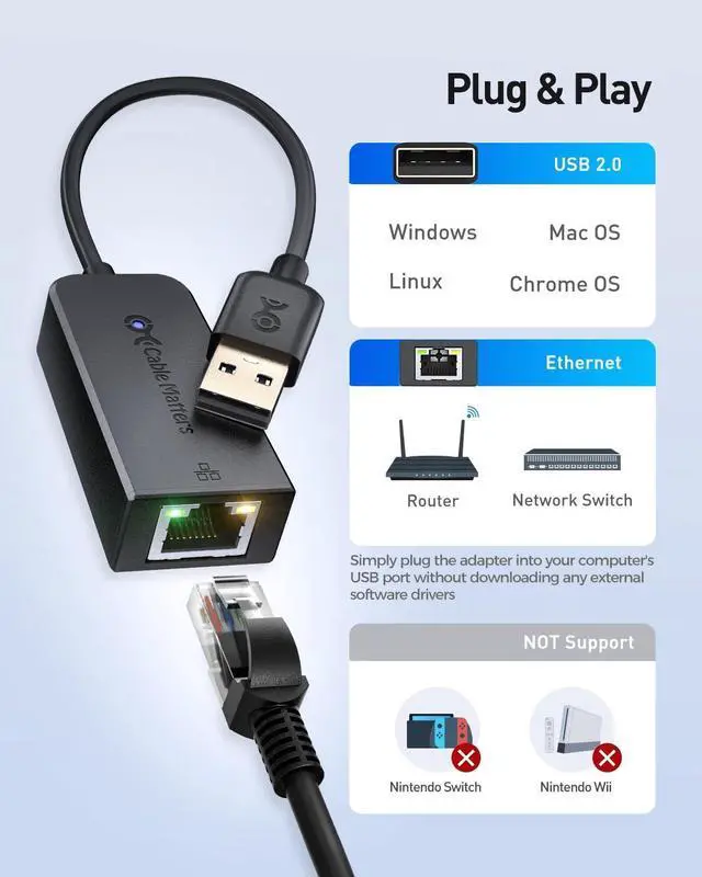 Ethernet USB adapter connects a computer or Raspberry Pi 3 to a router, modem, or network switch for a Fast Ethernet (100 Mbps) network connection; Connect the USB Ethernet adapter to your laptop without an Ethernet port ^^ Cost-effective USB network adapter for many computer applications that only require a 100 Mbps Ethernet connection; Use this convenient USB Lan adapter to replace a failed USB NIC or Ethernet port on an older computer ^^ Portable RJ45 to USB dongle weighs less than 1 ounce with a 6-inch cable tail to connect to your computer; Wired LAN USB adapter is more secure than most Wi-Fi connections ^^ Feature-filled USB to network adapter supports Preboot Execution Environment (PXE), Wake-on-Lan (WoL), Full-Duplex (FDX) and Half-Duplex (HDX) Ethernet, Crossover Detection, Backpressure Routing, Auto-Correction (Auto MDIX); Supports IPv4/IPv6 protocols in 10BASE-T and 100BASE-TX networks; Supports MAC address pass-through (MAC clone) with the Cable Matters EZ-Dock utility software (Windows) ^^ Driver-free Simple installation USB to RJ45 adapter for most computers; Diagnostic LEDs on this Ethernet USB adapter verify the power, connection and data transfer status; OS compatible Windows 11/10/ 8.1 /8/7/Vista/XP, MacOS 10.8 and up, Chrome OS and Linux for kernels up to 4.15; USB to RJ45 adapter is NOT compatible with Windows RT, or Android