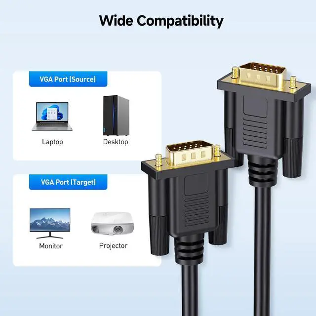 Older Devices: This VGA cable is designed to connect a VGA-equipped computer (commonly found on older models) to a monitor or projector with a 15-pin VGA port (also known as RGB, DB-15, DE-15, HD-15, HDB-15, or D-sub 15).