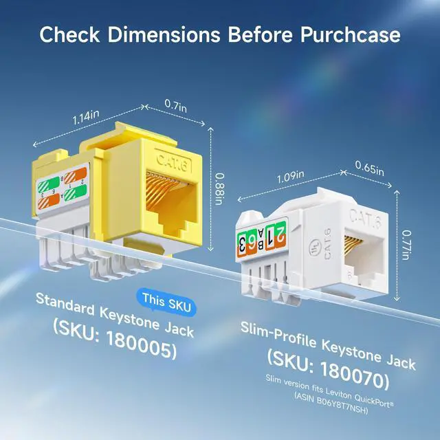 High-Performance Cat6 Keystone Jack: Delivers up to 10 Gigabit Ethernet speeds while remaining fully backward compatible with 10/100 Mbps Ethernet. Each Ethernet keystone jack meets or exceeds Category 6 performance standards (ANSI/TIA/EIA 568-C. 2), making it ideal for high-speed, future-proof networking. ^^