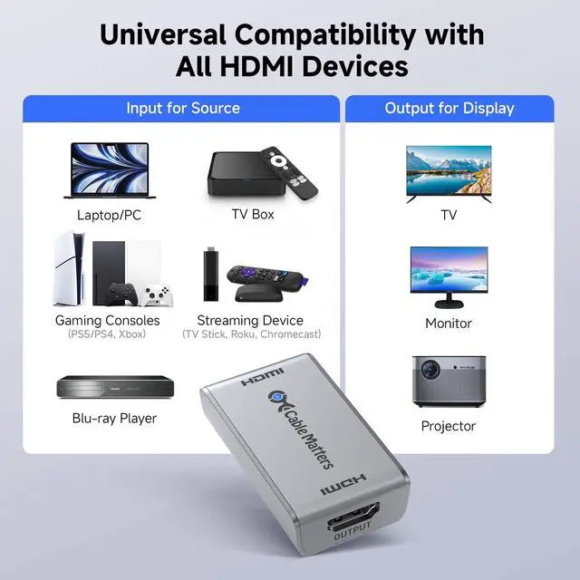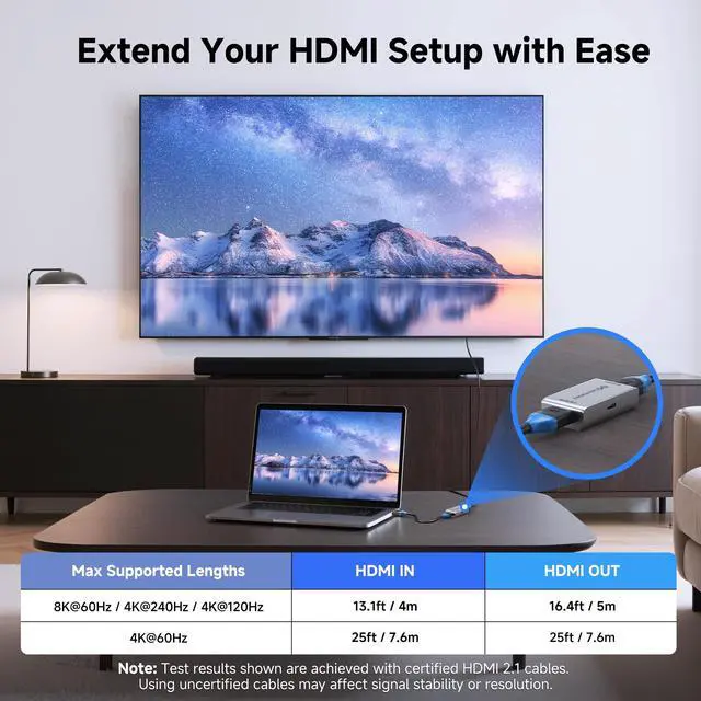 ^^ Important Notice: Connect INPUT to your source or computer and OUTPUT to your TV, monitor, or AVR. For best performance, use certified Ultra High Speed HDMI 2.1 cables. This repeater boosts signal strength but cannot fix existing ARC/eARC issues or faulty HDMI cables. Cable length limits apply to each side individually: up to 13.1 ft (4m) for HDMI IN and 16.4 ft (5m) for HDMI OUT when transmitting 8K@60Hz / 4K@240Hz.