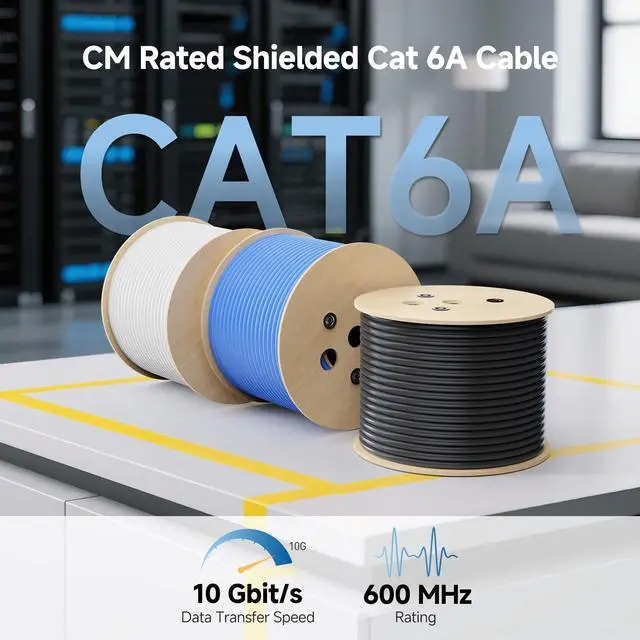 • Shielded Cat6a Bulk Ethernet Cable: CM-rated solid shielded Cat 6A Shielded/Foil Twisted Pair (S/FTP) bulk cable is engineered for demanding or harsh environments with high bandwidth needs. Equip your network with this Cat6a cable bulk/ Cat6a ethernet cable 500ft for 10 Gigabit Ethernet, with backward compatibility to 10/100/1000 Ethernet in the home, office, data center, or warehouse.