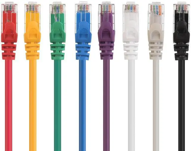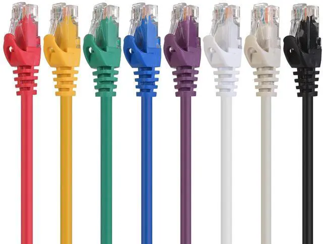 High Performance Internet cable is Cat5e rated; The Ethernet cord with 24 AWG copper wire provides universal connectivity for LAN network components such as PCs, computer servers, printers, routers, switch boxes, network media players, NAS, VoIP phones, PoE devices, and more ^^ Build your home or office network with Gigabit Ethernet patch cable; A wired Cat 5e cable network is more reliable and secure than a wireless network or Cat 5 cable network for your internet connections; Comes with 8-pack Cat5e Ethernet cables in Black, Blue, Gray, Green, Purple, Red, Yellow, and White.