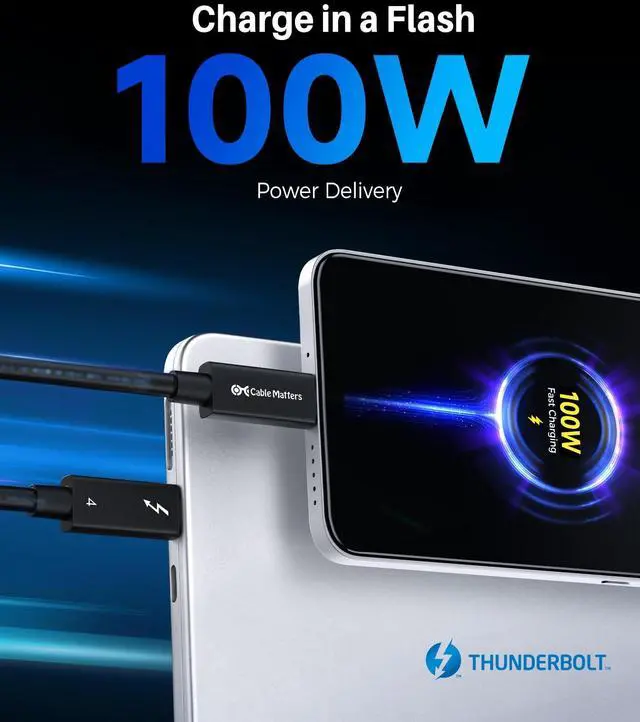 Cable: The Cable Matters Active Thunderbolt 4 cable features the latest Thunderbolt 4 and USB4 standards and is the longest certified active cable on the market that does it all. Take full advantage of the Thunderbolt 4 40Gbps connector with this long Thunderbolt 4 cable and USB4 cableideal for extended setups in professional or home environments. ^^ Certified Thunderbolt 4 Cable with 100W