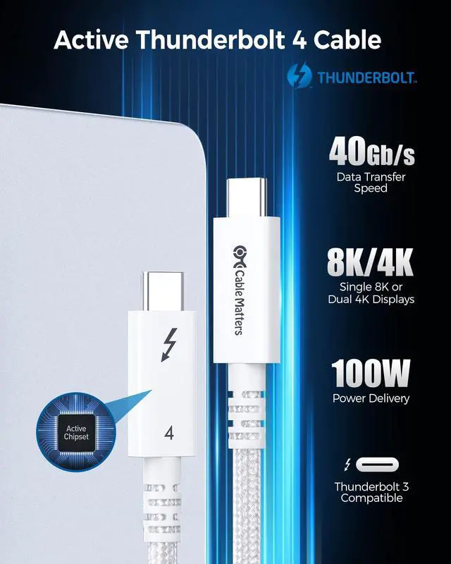 The Cable Matters braided active Thunderbolt 4 cable features the newest Thunderbolt cable and USB 4 cable standards and is a long active cable on the market that does it all; Take advantage of the new Thunderbolt 4 40Gbps connector with this long Thunderbolt 4 cable and USB 4 cable ^^ Certified Thunderbolt4 cable supports the Thunderbolt 4 features and performance; Enjoy blazing-fast 40Gbps data transfer on all Thunderbolt 4 devices; It features enough bandwidth to drive one 8K display or two 4K displays; Connect the latest high definition monitors and TVs for vibrant, crystal-clear 8K video and authentic high-quality audio; Power and charge devices with Power Delivery 3.0 100W charging support for doing it all with a single cable ^^ Premium construction of the Intel certified active Thunderbolt cable features a braided cable for improved durability; Durable metal connector housing provides long-lasting protection; High quality Thunderbolt 4 cable is perfect for permanent installation or frequent travel in a laptop briefcase ^^ Backward compatible Thunderbolt 4 to Thunderbolt 3 cable features full backward compatibility with Thunderbolt 3 cable standards and Thunderbolt 3 devices and hosts; Replace your Thunderbolt cable with a new one which fully supports the latest features to future proof your setup ^^ Future-proofed Thunderbolt 4 cable also functions as a USB4 cable, with support for the latest USB 4 cable standard; Connect USB4 devices and transfer up to 40Gbps of data depending on host and device USB4 support; USB-C cable is also fully backward compatible with USB-C 3.2, 3.1, and 2.0 speeds and devices, and supports USB-C features such as DisplayPort Alt Mode (DP Alt Mode) and USB Power Delivery (USB-PD).