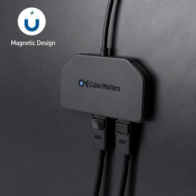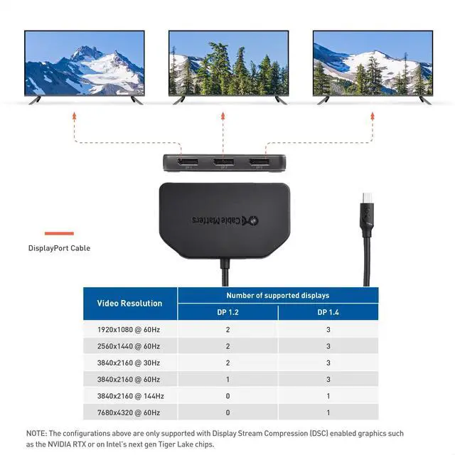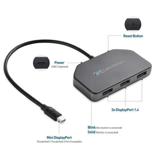 Create the ultimate triple-monitor workstation with the Cable Matters Display Port switch; Connect a laptop with a Mini DisplayPort port to expand a laptop computer into a triple-monitor workstation; included Mini DisplayPort to DisplayPort adapter supports connecting the DP splitter to a desktop computer ^^ DisplayPort Hub with triple monitor support features 3 DisplayPort 1.4 ports for 32.4G bps of video and audio bandwidth; Leverage the latest DisplayPort technology to connect up to three high-resolution monitors; Display Port splitter supports three 4K @60Hz monitors, two 8K@30Hz, or one 8K@60Hz monitor with a compatible DisplayPort 1.4 host with the latest Display Stream Compression (DSC) and Multi-Stream Transport (MST) support ^^ Low power consumption design of the Mini DisplayPort Hub is entirely bus-powered from the host Mini DisplayPort port; optional USB-C power connector provides compatibility with low-powered devices that do not transfer enough power over the mDP hub connection ^^ Take advantage of the latest DisplayPort 1.4 features including High Dynamic Range (HDR) and increased audio support with this Display Port 1.4 splitter; Connect the newest 4K and 8K monitors on supported hardware; DisplayPort Splitter 144Hz supports 144Hz and 240Hz depending on host and monitor DisplayPort version and resolution; ^^ DisplayPort splitter 1 in 3 out features a magnetic mounting system for attaching to metal computer cases and desktops; Flexible 12-inch cable tail on the MST hub avoids straining the cable or the DisplayPort port
