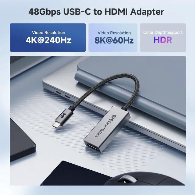 HDMI 2.1 Adapter: Upgrade to HDMI 2.1 or future-proof your setup with the Cable Matters USB C to HDMI 2.1 Adapter; HDMI to USB C cable adapter combines the latest HDMI 2.1 standard with the versatility of USB-C; The HDMI USB C adapter (USB C adapter to HDMI) supports up to 8K 60Hz resolution on compatible displays and devices; HDMI to Type C adapter is perfect for ultra high resolution displays ^^ Stunning 8K@60Hz / 4K@240Hz