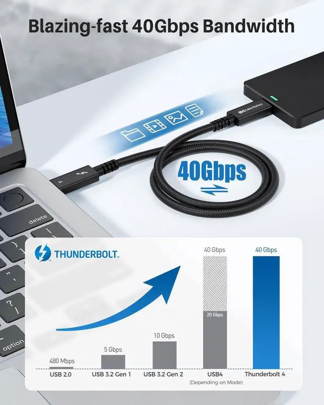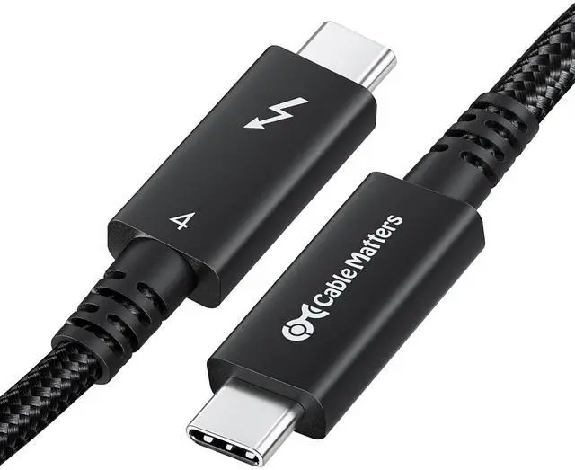 The Cable Matters braided active Thunderbolt 4 cable features the newest Thunderbolt cable and USB 4 cable standards and is a long active cable on the market that does it all; Take advantage of the new Thunderbolt 4 40Gbps connector with this long Thunderbolt 4 cable and USB 4 cable ^^ Certified Thunderbolt4 cable supports the latest Thunderbolt 4 features and performance; Enjoy blazing-fast 40Gbps data transfer on all Thunderbolt 4 devices; It features enough bandwidth to drive one 8K display or two 4K displays; Connect the latest high definition monitors and TVs for vibrant, crystal-clear 8K video and authentic high-quality audio; Power and charge devices with Power Delivery 3.0 100W charging support for doing it all with a single cable ^^ Premium construction of the Intel certified active Thunderbolt cable features a braided cable for improved durability; Durable metal connector housing provides long-lasting protection; High quality Thunderbolt 4 cable is perfect for permanent installation or frequent travel in a laptop briefcase ^^ Backward compatible Thunderbolt 4 to Thunderbolt 3 cable features full backward compatibility with Thunderbolt 3 cable standards and Thunderbolt 3 devices and hosts; Replace your Thunderbolt cable with a new one which fully supports the latest features to future proof your setup ^^ Future-proofed Thunderbolt 4 cable also functions as a USB4 cable, with support for the latest USB 4 cable standard; Connect USB4 devices and transfer up to 40Gbps of data depending on host and device USB4 support; USB-C cable is also fully backward compatible with USB-C 3.2, 3.1, and 2.0 speeds and devices, and supports USB-C features such as DisplayPort Alt Mode (DP Alt Mode) and USB Power Delivery (USB-PD).
