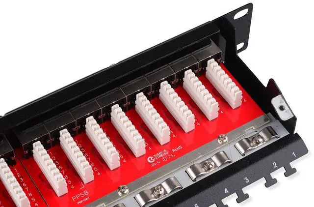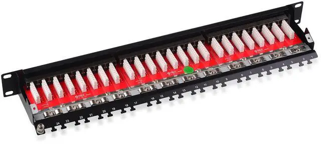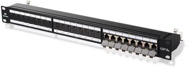 Heavy duty 24-port shielded patch panel supports Cat6a Ethernet cables; UL Listed network patch panel cat6a complies with the fire safety requirement. Made for Cat 6a cabling, but backwards compatible with Cat 6, Cat 5e and Cat 5 cabling. ^^ Future-proof your network connection for 10-Gigabit Ethernet with this durable RJ45 cat 6a patch panel; Designed for superior protection against EMI/RFI and suppression of alien crosstalk (AXT) ^^ Install this Ethernet cat6a patch panel shielded effortlessly in universal 19" racks, cabinets, or wall mount brackets with 1U ( 1.75" ) standard height ^^ Gold plated contacts ensure a correction free connection; Numbered ports and color-coded T568A and T568B wiring diagram give quick reference ^^ The integrated cable management bar and cable separation rows relives cable strain and reduces cable clutter; Jack shutters protect the gold plated contacts from corrosion and dust when cable is not plugged in