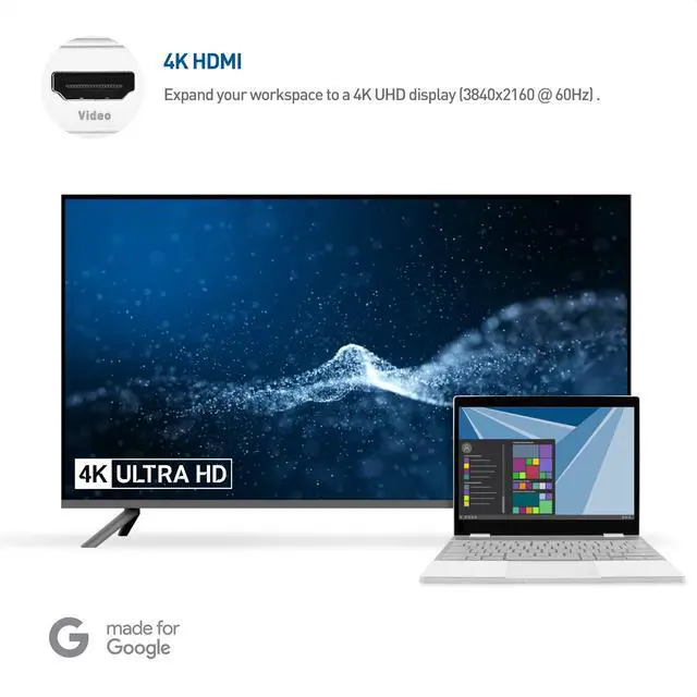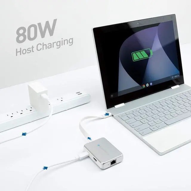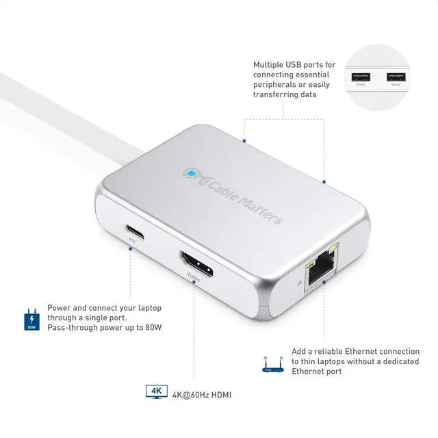 5-in-1 function USB-C hub provides all the necessary portsfor on-the-go productivity. Features magnetic cable management and a travel-friendly design ^^ Expand your desktop to an external 4K 60Hz HDMI display ^^ Connect two USB peripherals such as a wireless mouse & flash drive ^^ Avoid spotty Wi-Fi and connect directly to an Ethernet connection at 480Mbps ^^ Accomplish all of the above while charging your laptop at up to 80 watts, all through a single port