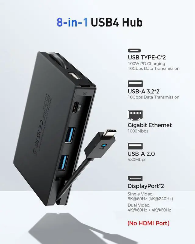 Important Compatibility Note: This USB4 hub features 2x DisplayPort outputs (no HDMI). macOS supports only one extended display up to 4K@120Hz or two mirrored displays. Thunderbolt 3/USB-C hosts support only 1x 4K@30Hz or 2x 1080p@60Hz. Achieving single 4K@240Hz or 8K@60Hz requires DisplayPort 1.4 output over a USB4/Thunderbolt 4 host and certified DisplayPort cables. DDC/CI is not supported ^^ 8-in-1
