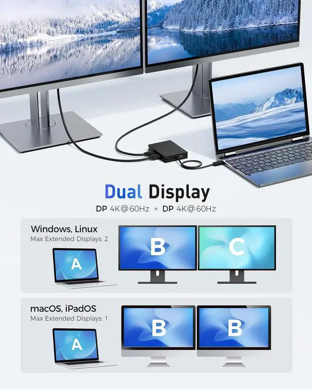 Portable USB4 Multiport Adapter: Revolutionize your on-the-go productivity with the ultimate laptop companion. Despite its compact size, this USB4 Dock with dual DisplayPort video packs an incredible punch, boasting a lightning-fast 40Gbps transmission speed and supporting dual 4K@60Hz Ultra High-Definition videos. Unlike other options limited to USB-C Gen 2's 10 Gbps, our USB 4 Dual DisplayPort Docking Station harnesses the cutting-edge USB4 40Gbps technology, setting it apart from the competition ^^ Dual Video 4K 60Hz