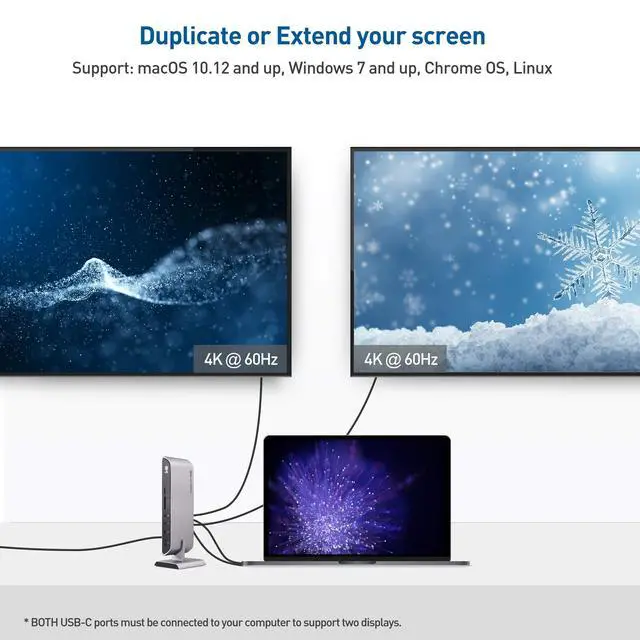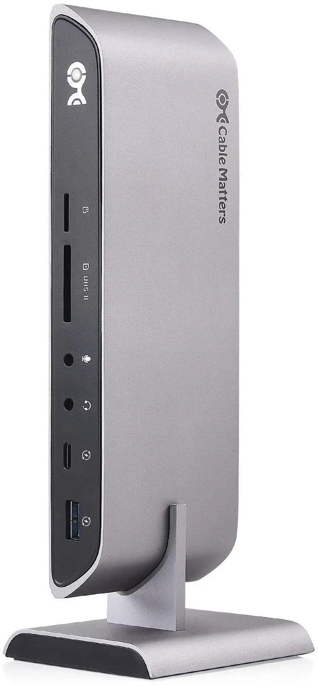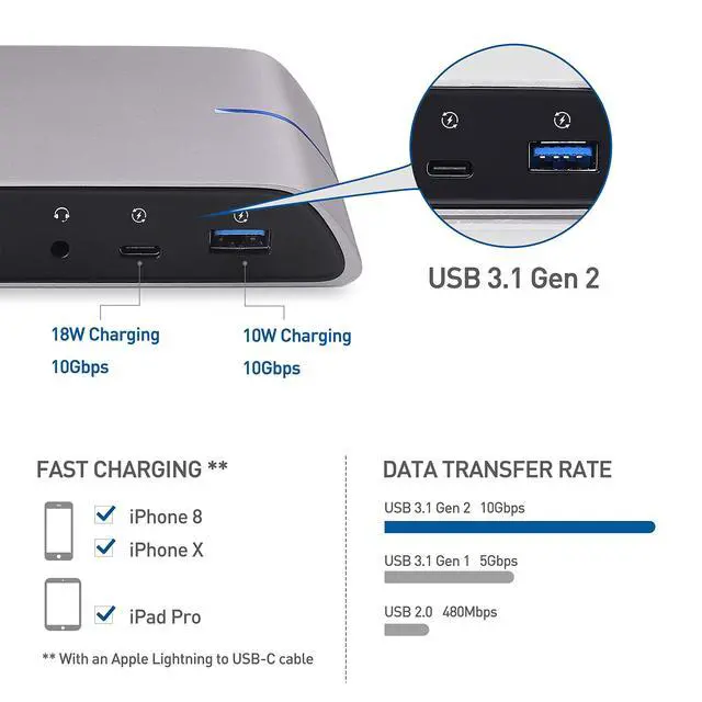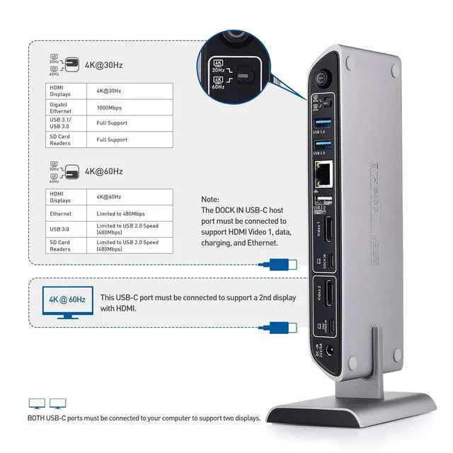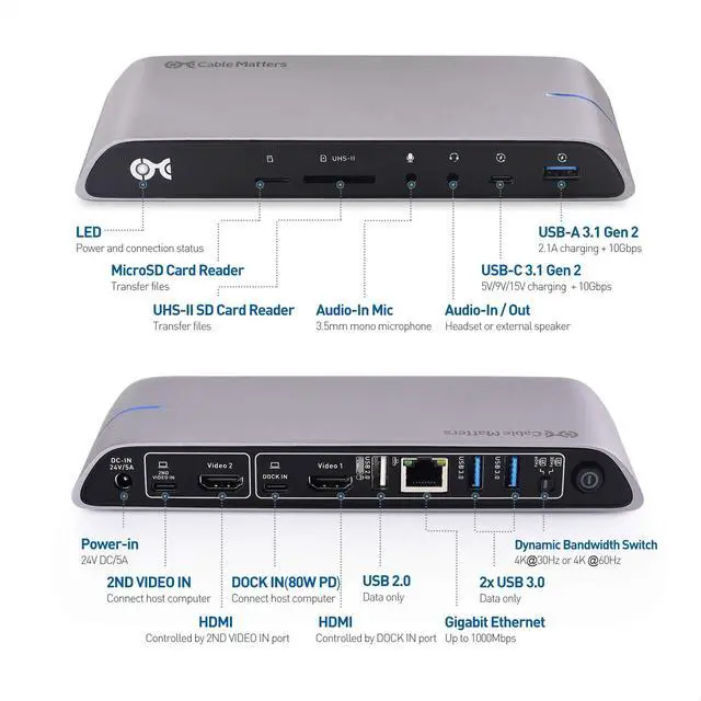 Dual input laptop docking station for a computer with two USB-C or Thunderbolt 3 ports; Charge a Thunderbolt 3 notebook while in use up to 80W; Connect a wireless mouse or keyboard and add a wired Ethernet network; Transfer files from an SD memory card or a USB flash drive; USB-A 3.1 Gen 2 port supports a 10Gbps data transfer rate and 2.1A watt charging; Expand your workspace with this laptop dock instead of purchasing a separate USB C dongle for each function ^^ Dual 4K HDMI video support over two USB-C portswith this laptop dock with a USB Type C hub; Mac dual video docking station supports two 4K HDMI displays unlike some USB C docking stations for multiple devices ^^ Dynamic bandwidth configuration with a 4K/30Hz or 4K/60Hz switch to allocate the USB-C bandwidth; Select the maximum 4K 60Hz video resolution for dual displays with a limited data transfer speed or use a lower video resolution to enjoy Gigabit Ethernet and USB 3.1 Gen 2 with a 10Gbps data transfer rate; Select the mode needed for your desktop requirements with this USB-C dock ^^ Port expander USB-C hub with 80W power delivery combines the bandwidth of two USB-C portsto supports dual 4K 60Hz displays over two USB C cables; Transfer files from a UHS-II SD card at 2x the rate of UHS-I; Fast-charge a smartphone such as the iPhone X / iPhone 8 / iPad Pro up to 18W; Type C hub connects a Gen 2 10 Gbps HDD dock with USB Type A; USB C Power Delivery powers and charges a notebook up to 80 watts while adding the functions of a desktop computer ^^ Thunderbolt 3 & USB-C universal dock is compatible with the Apple MacBook Pro, MacBook Air and iMac; Thunderbolt 3 hub is Windows and Linux compatible with laptops with two USB C portsthat support video over USB C; USB-C docking station includes two USB-C Gen 2 full featured cables in a 3.3 foot length
