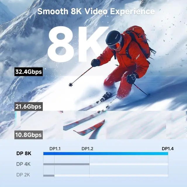 Audio Support: This premium Display cable supports resolutions up to 8K (7680x4320 @ 60Hz), 5K (5120x2880 @ 60Hz), 4K Ultra HD (3840x2160 @ 240Hz), and 1080P Full HD. The Display Port to Display Port cable enables flawless audio pass-through for uncompressed 7.1, 5.1, or 2-channel digital audio. ^^ Perfect for