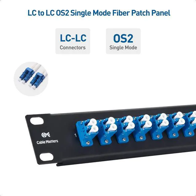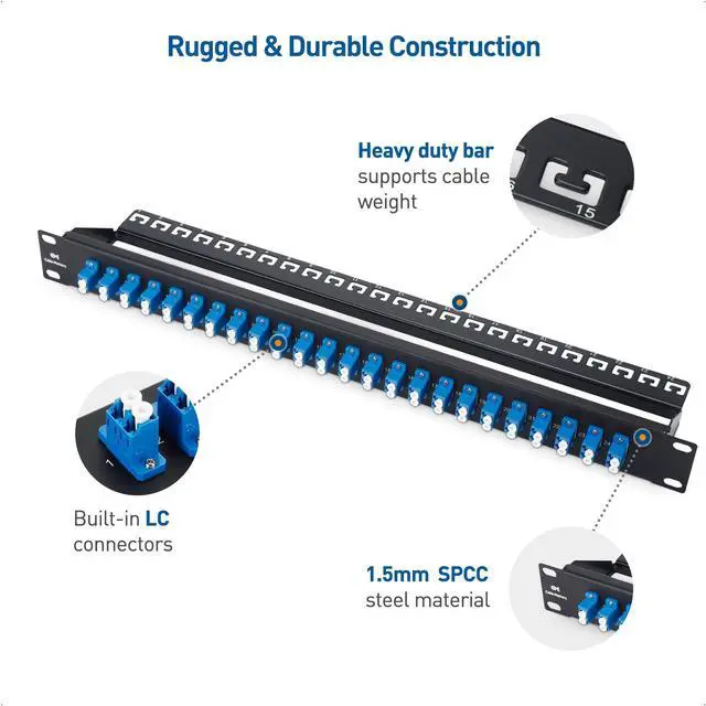 Expand your network options with this 1U fiber adapter panel; 1U patch panel fiber adds 48 individual LC to LC OS2 single mode fiber connectors to a rack mounted server room or network cable system ^^ Standard size 1U rack mount fiber patch panel LC is ideal for expanding a network big or small; Rack mount 1U patch panel fiber connects to a standard 19-inch server rack, and measures across one standard rack unit ( 1.7 inches) ^^ 1U LC fiber panel adds 48 LC plugs to your network; Connect high speed fiber optic network cables like LC to LC cables to the network patch panel fiber optic at blazing-fast 10Gbps speeds ^^ Superior construction of this single mode fiber patch panel includes durable steel material for long lasting support; The 19-inch fiber patch panel features a back support bar for extra stability and weight support ^^ Fiber patch panel OS2 is an ideal cost-saving patch panel; The fiber patch panel 19-inch includes both a patch panel and connectors in one