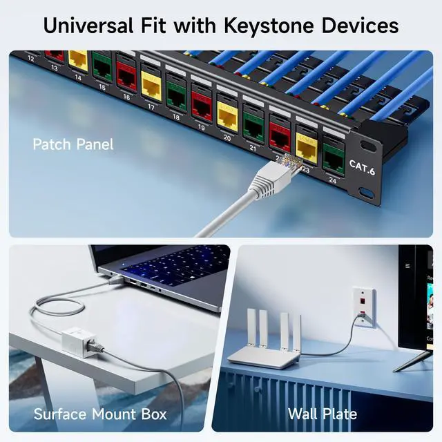 High-Performance Cat6 Keystone Jack: Delivers up to 10 Gigabit Ethernet speeds while remaining fully backward compatible with 10/100 Mbps Ethernet. Each Ethernet keystone jack meets or exceeds Category 6 performance standards (ANSI/TIA/EIA 568-C. 2), making it ideal for high-speed, future-proof networking. ^^