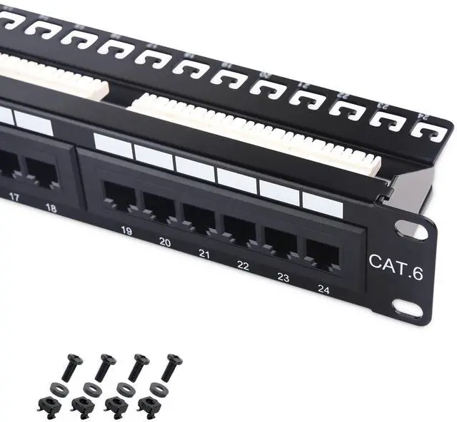 Port Patch Panel: This 24-port Cat 6 patch panel supports Ethernet and is backward compatible with Cat 5e and Cat 5 cables. Designed for 10-Gigabit Ethernet, the wall mount patch panel is ideal for use with Gigabit and 10Gigabit network switches. Also supports PoE, PoE+, and PoE++ for powering devices over Ethernet like IP cameras and wireless access points. ^^ Effortless Installation in 19"