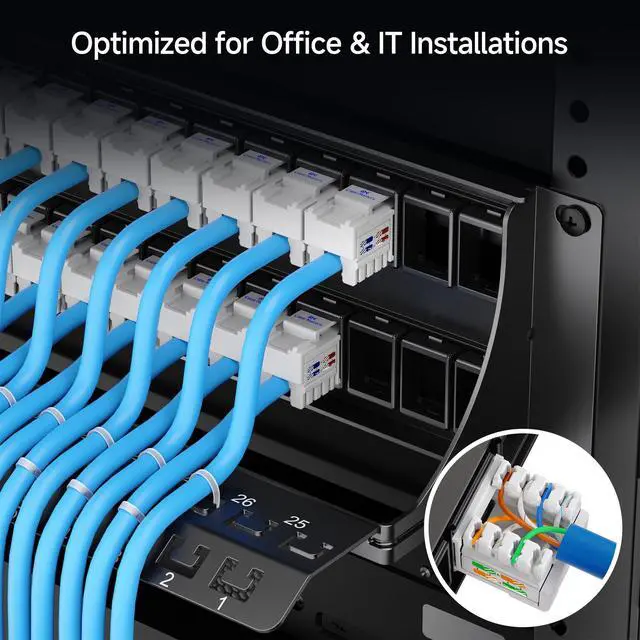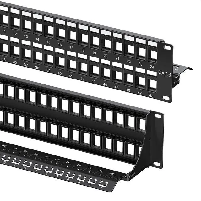 Panel Design: This keystone patch panel 48 port is designed to streamline cable routing and maximize space in server rooms or network closets. It offers twice the capacity of a 24 port keystone patch panel without increasing rack width, making it a space-efficient solution. ^^ Integrated Cable Management &