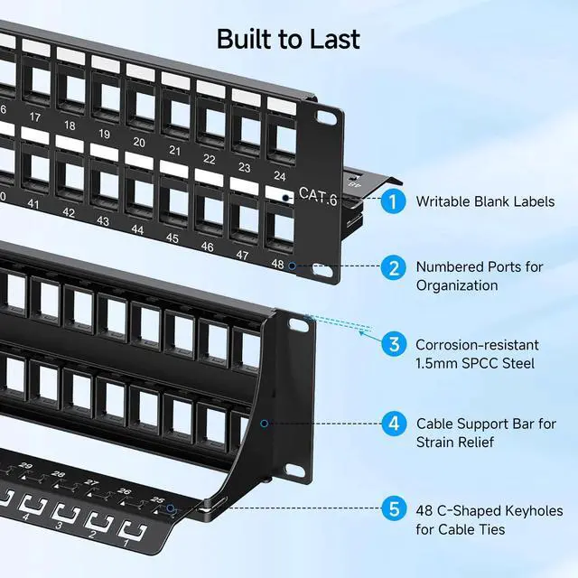Support Bar: The keystone jack patch panel (keystone blank patch panel) includes a removable rear support bar with 48 evenly spaced C-shaped keyholes and labeled ports. Secure and organize cables with zip ties for a clean, professional installation. Mounting Screws Not Included. ^^