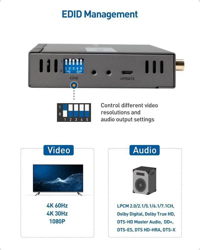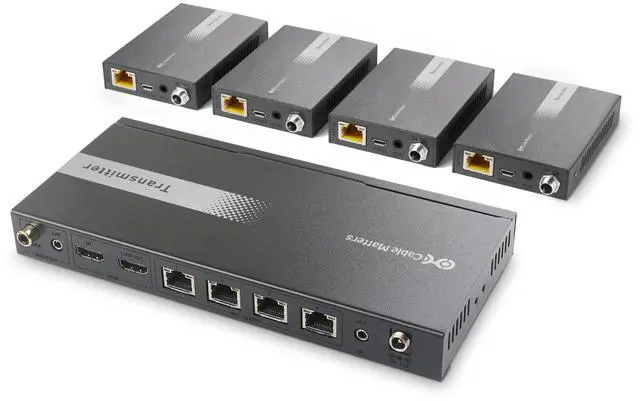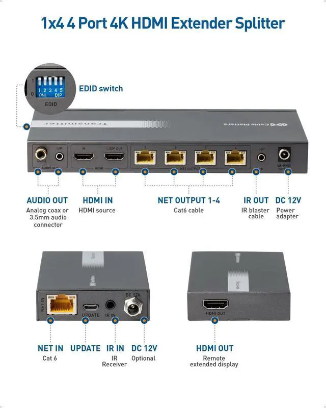 4 Way HDMI splitter extender distributes and extends identical 4K HDMI video and audio signals from a single HDMI source such as a computer, Blu-ray player, media streamer, cable box, or game console to 4 remote displays over Cat5/Cat 6 cable up to 164 ft at 4K 60Hz, 196 feet at 4K 30Hz, or 229 feet at 1080p ^^ Control the HDMI video source from a remote location with the included IR cables that forward commands over a dedicated DDC channel for convenience and security; The powered HDMI splitter 1 in 4 out converter is compatible with HDCP compliant equipment for viewing copy protected content and integrating with HDMI switch, splitter, or matrix equipment ^^ The 4 port HDMI Extender Splitter 4K supports up to 4K 60Hz and the full range of audio formats including Dolby True HD and DTS-HD Master lossless audio.