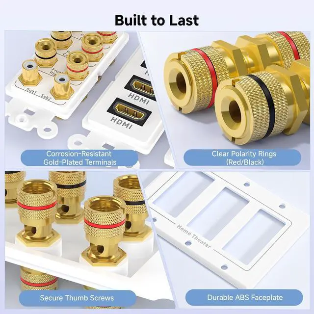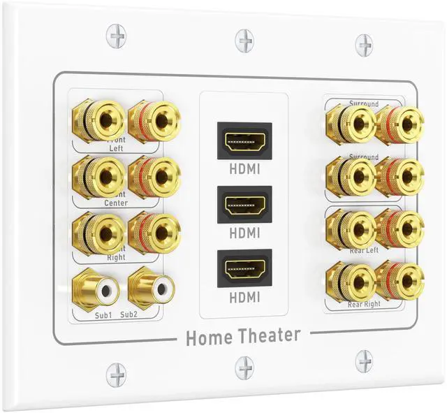 3 gang 7.2 surround sound distribution wall plate can connect 7 speakers, 1 subwoofer and three devices with HDMI; Install this audio video wall plate in a 3 gang low voltage mounting bracket for your home theater system; Low-profile Speaker wire wall plate is 4.5 x 6.4 x 0.2 inches; Mounting screws are included ^^ Screw type binding post banana plug wall plate with adjustable thumb screws can be used with banana plugs, spade connectors, or bare 12 to 18 AWG speaker wires; 7 speaker wall plate is labeled for the front, rear and center speakers; Binding post terminals on this 7.2 speaker wall plate have red and black ring labels on the front and rear of the 7.2 or 7.1 surround sound system wall plate for easy identification ^^ Subwoofer wall plate with female couplers can connect two RCA subwoofer cables concealed behind the wall; Install this speaker faceplate for a future 7.2 receiver upgrade ^^ HDMI wall plate with pass-thru for common video resolutions including 4Kx2K (UHD) including 3840x2160 and HD 1080p; Audio pass-thru support for DTS-HD Master Audio and Dolby TrueHD and more; Home theater wall plate with gold-plated binding post and RCA connectors provide a reliable connection and distribute authentic audio and vibrant video ^^ 7.2 Speaker System Wall Plate with