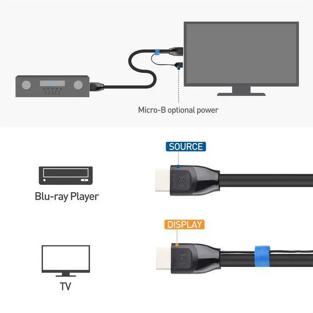 Active 8K HDMI cable supports high bandwidth HDR with a 48 Gbps bandwidth as specified in HDMI 2.1 standard; The 8K HDMI cord offers more than 2x the HDMI 2.0 bandwidth of existing 4K HDMI cables; Supports a 21:9 cinema aspect ratio, HDCP 2.2, 32 audio channels and a 1536 KHz sampling rate ^^ Long HDMI cable with active HDMI cable chipset boosts the HDMI signal, preventing signal loss at long distances while maintaining full 8K 60Hz support; Optional MicroB power port provides a power boost for underpowered devices, ensuring maximum compatibility; Go the distance with an active HDMI cable 8K for connecting mounted TVs to distant entertainment centers or game consoles like the PlayStation 5, Xbox Series X, PCs with the latest 8K graphics cards, and more ^^ High speed HDMI to HDMI cable supports up to 8K (7680x4320) including 4K and 1080p; Fully compatible with HDMI eARC (Enhanced Audio Return Channel) features for immersive audio support including Dolby Atmos and DTS X surround sound 7.1 and 5.1 ^^ The HDMI 8K cable supports gaming consoles such as the PS4 PRO and Xbox One with advanced features; Enjoy the ultimate video streaming experience with Apple TV and Roku Ultra ^^ 48Gbps HDMI cable is backwards compatible with HDMI 2.0 cable and supports 4:4: 4 RGB HDR, 12-bit color, and Dolby Vision